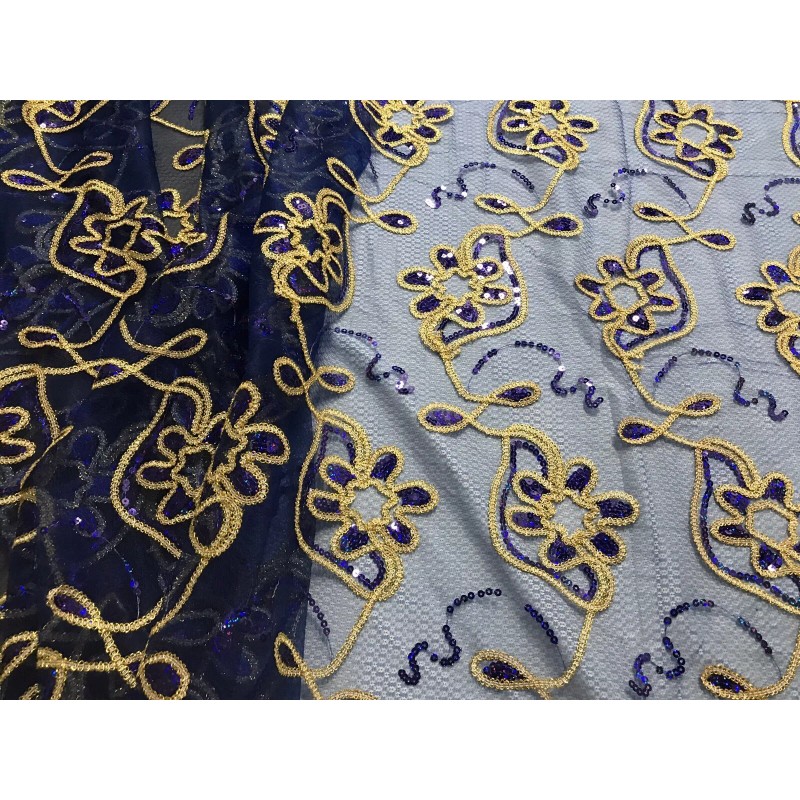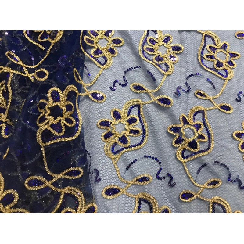 A beautiful lace measures 48" width This lace has extravagant royal blue multicolor sequins with gold embroidery that makes the fabric look very elegant. this amazing fabric has a nice blue mesh backing . This fabric features finish Edge on both ends for a classy finish. Use this fabric to design a dress, or decorate your tables/chairs to create elegant decor that your guests will never forget. It can also be used for evening gowns, dresses, draping, costumes, table covers, table runners, and chair covers. A lace that you can style in many ways, now available at a great price! Be sure to check out our other color variations on sale!