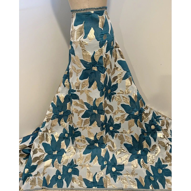 This stunning brocade fabric features a beautiful floral pattern in Teal Green and Gold. The metallic finish adds an antique/vintage touch to the overall look. The fabric is suitable for various purposes including dresses, table tops, curtains, dance/sportswear, costumes, crafts, and pillows.