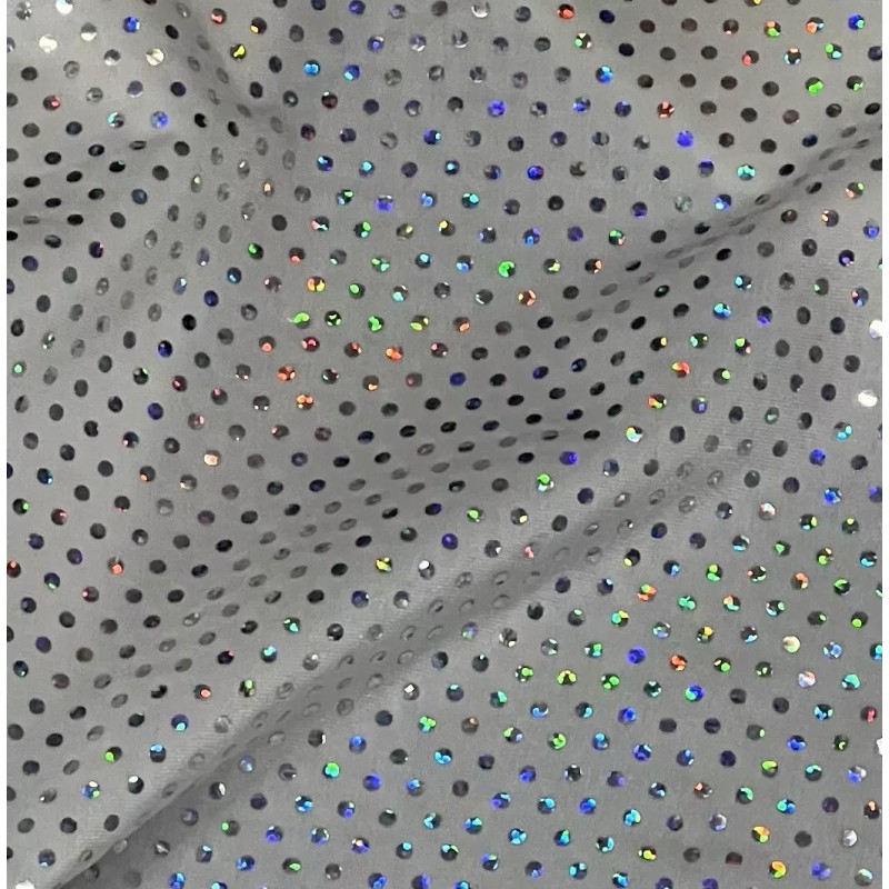 This White Silver Iridescent Hologram Stretch Spandex Fabric, sold by the yard features a dazzling dots pattern with a 2-way stretch for flexibility. The fabric is made of polyester material and is 54 inches wide, suitable for various apparel projects such as dancewear, swimwear, and costumes. The spandex fabric is medium weight, sparkles with a holographic effect, and has a fluorescent sheen, making it ideal for creating eye-catching garments and accessories.
