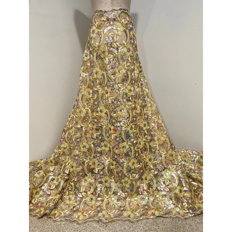 Add a touch of elegance to your sewing projects with this beautiful yellow iridescent sequins embroidered lace fabric. The fabric is made of synthetic mesh lace material and features a floral pattern, making it perfect for apparel, accessories, cushion, table top, wedding, accessories, hats, costume, stage, and crafts. It is sold by the yard, with a width of 46'' to 60'', and is handmade for a unique touch. The fabric is perfect for those who love antique/vintage and sewing themes, and it comes in a medium fabric weight. The sequins lace adds a special touch to the fabric, making it suitable for any occasion.