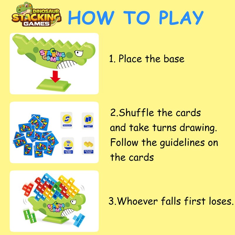 - DINOSAUR STACKING BASE & FUN GAME FOR KIDS & FUN FOR THE WHOLE FAMILY & FUN PARTY GAME. 64PCS Dinosaur Tetra Tower Game Set Includes 64 Stacking Tetra Blocks in 4 colors (8 types x 8 pieces)、1x Dinosaur Stacking Base、22x Bigger Draw Cards, 1x Dinosaur Storage Box, suit for 1- 4 players.