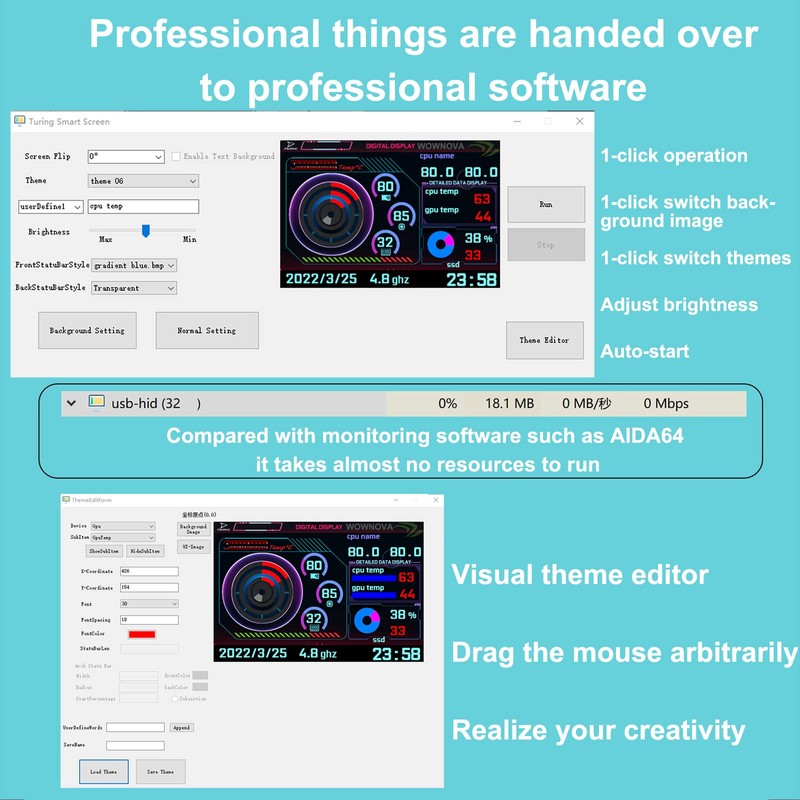 - Simple and Feature-richCustomizable screen layout. Horizontal and vertial screen switching. Visual theme editor: drag the mouse arbitarily to realize your creativity. Energy saving & environmental protection. Turn off the screen automatically and Comfortable eye protection Brightness adjustment.