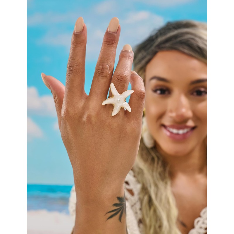 - Acrylic Pearl Starfish Ring: Made with glossy acrylic and adorned with tiny white pearls, this ocean starfish ring adds shimmer and elegance in a lightweight, easy-to-wear design