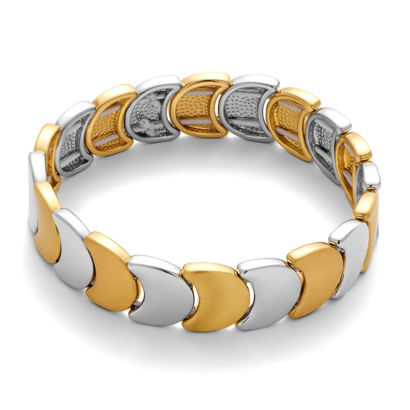 The two tone design of this stretch bangle bracelet is reminiscent of timeless elegance and adds a classic twist to your style.