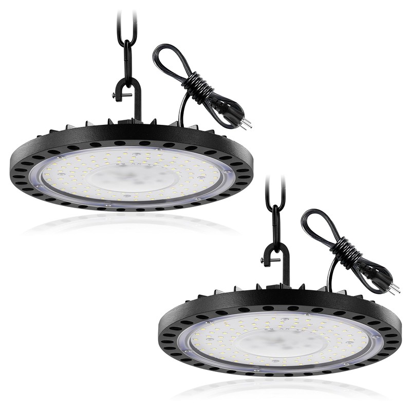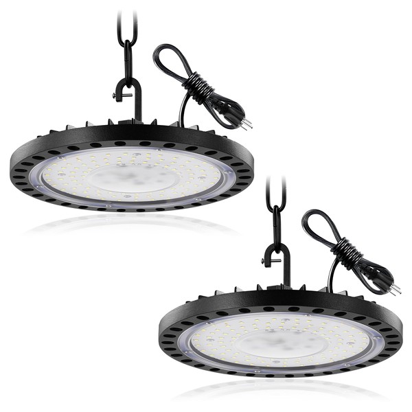 WOWSPEED 2 Packs 100W LED High Bay Light with US Plug, 10000LM 5000K UFO LED High Bay Lights with 5FT Cable, IP65 LED UFO Bay Lighting with Chain&Safety Rope for Warehouse Workshop Factory Garage