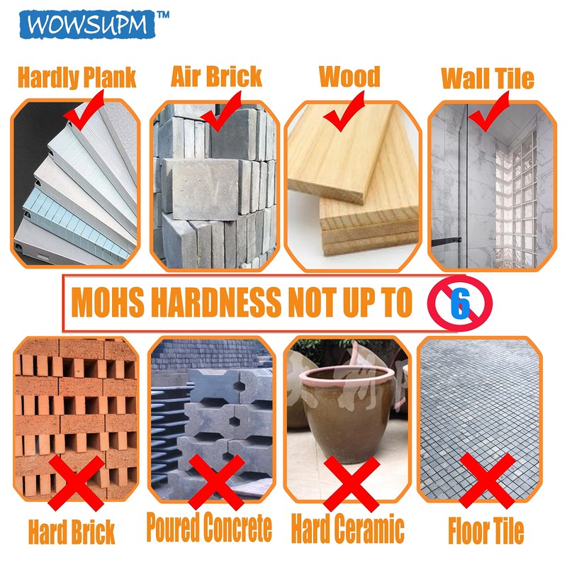 • Application: Ideal drilling for multiple materials: hardy plank, hard wood(not with nail), drywall, MDF, fiberglass, soft wall tile, air brick, plasterboard. Cutting material MOHS hardness:Not up to 6. For use in standard rotary drills. Not for use in Hammer mode.