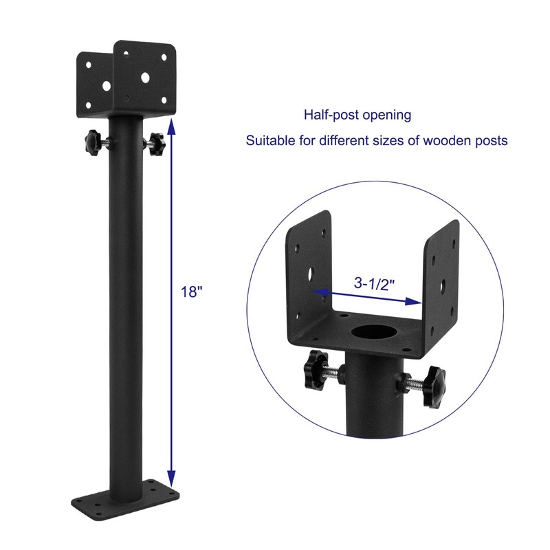 - The roof riser support pole is 18 inches high and 1.55 inches in diameter. U-shaped saddle brackets rotate 360° horizontally for wood post mounting in different orientations and lock with screws.