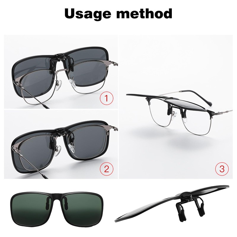 - 【 Usage Method 】:Open the clip-ON sunglasses and align it with the upper edge of the glasses. Press the clip gently until it is firmly attached to the frame. Flip the lens up or down to protect the sun when not in use. Clean the lens with a cloth to remove stains and fingerprints.