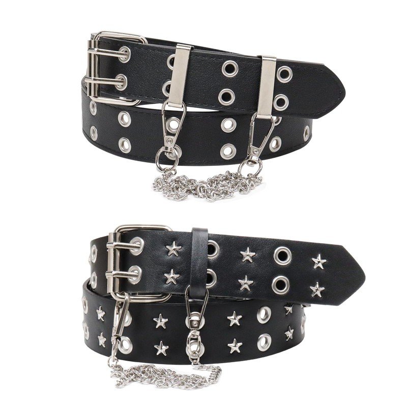 WQYILEAER 2 Pcs Studded Belt, Y2K Belt Star Belt Double Grommet Belt with Chain Goth Punk Rock for Women Men