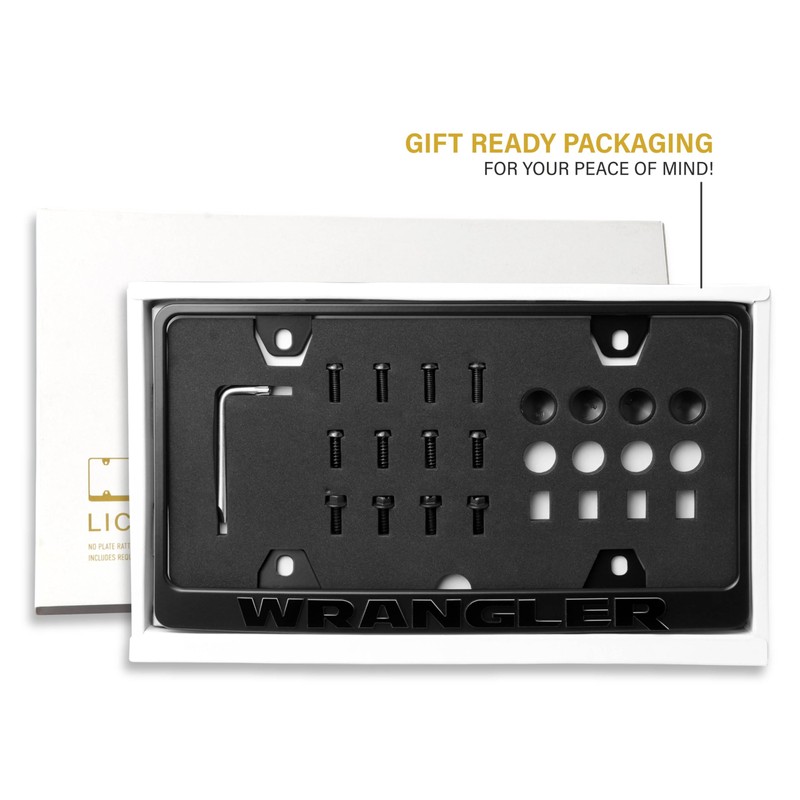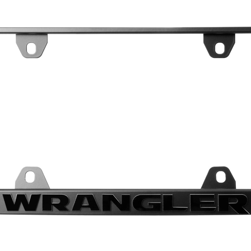 Wrangler License Plate Frame – Stealth Black Powder Coat UV Resistant Rust-Proof Steel Plate Holder - One Piece - Compatible with 1987-2025 Wrangler SUV (3D RAISED LETTERS with MOUNTING HARDWARE)