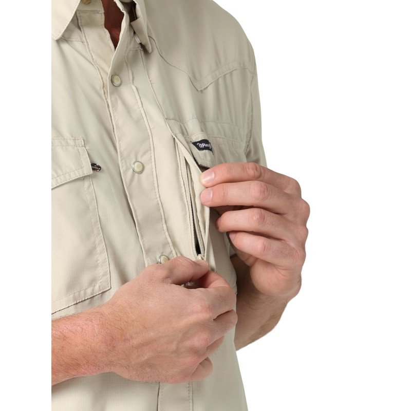 - UTILITY STORAGE. Finished with a hidden snap-down collar, this men's shirt features (2) Napoleon chest pockets with a pencil slot, as well as a glasses cleaner built into the hem.