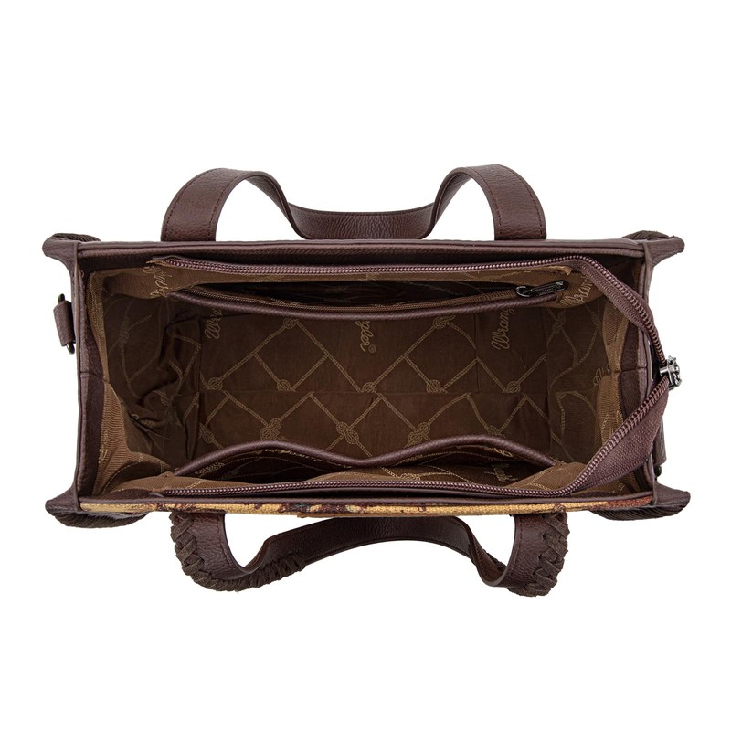 - Western style handbags features a cowboy print with whipstitch detailing for an authentic, rustic charm that celebrates Western heritage.