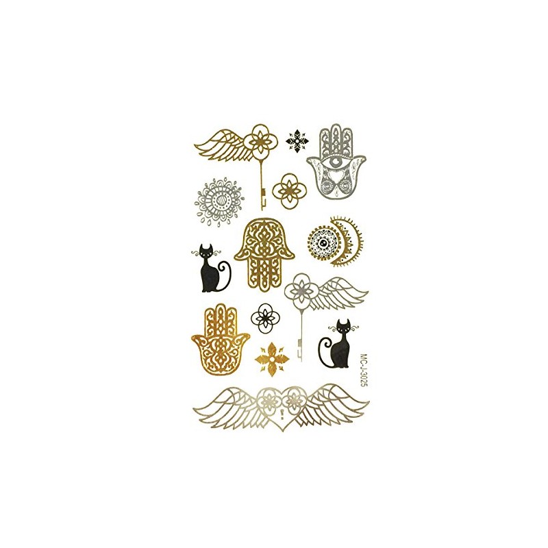 - Make a statement with these celebrity inspired temporary tattoos in metallic gold, silver, and black.