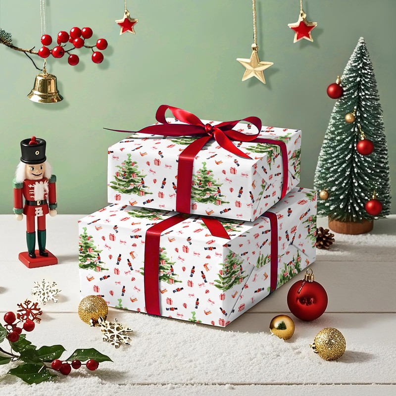 - Christmas Design: Watercolor Christmas trees, classic nutcracker, pink bows, festive presents, and hot air balloons design, create a cheerful festive atmosphere. The Christmas wrapping paper will make your gift wrap more textured and special.