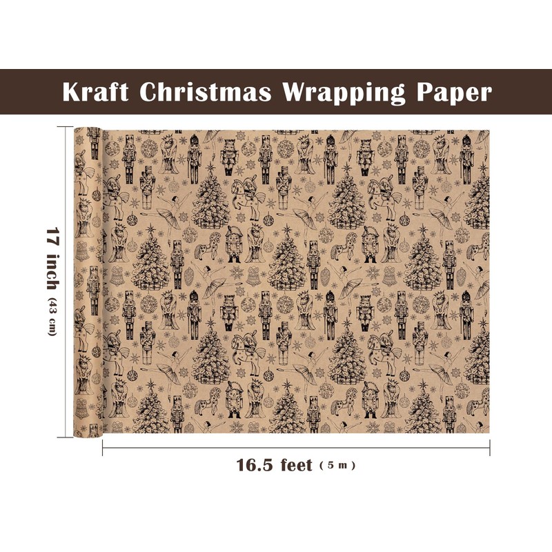 - Kraft Christmas Design: Nutcrackers, ballerinas, Christmas trees, and snowflakes in a classic black sketch style are printed on kraft wrapping paper, creating a elegant festive atmosphere. This design will make your gift wrap more textured and truly special.