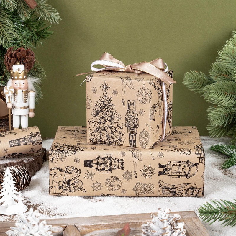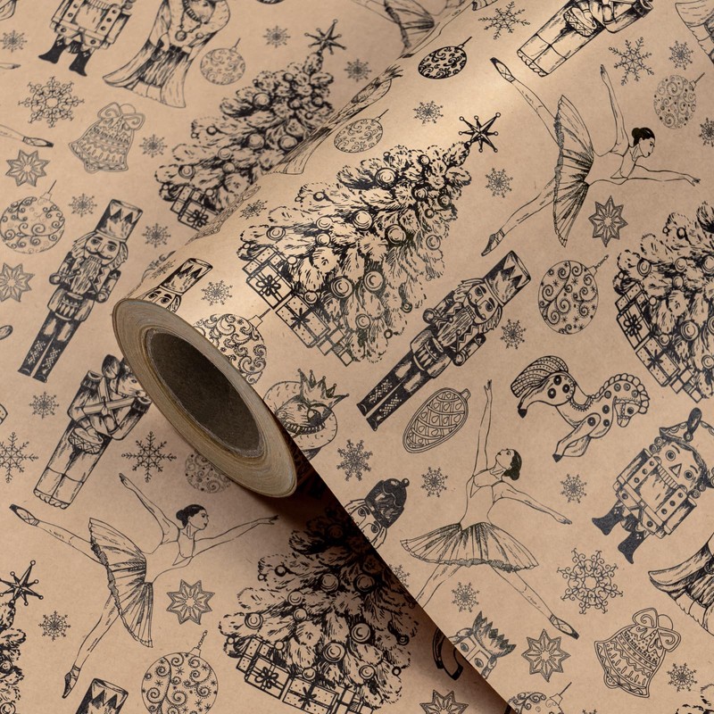 Kraft Christmas Design: Nutcrackers, ballerinas, Christmas trees, and snowflakes in a classic black sketch style are printed on kraft wrapping paper, creating a elegant festive atmosphere. This design will make your gift wrap more textured and truly special.