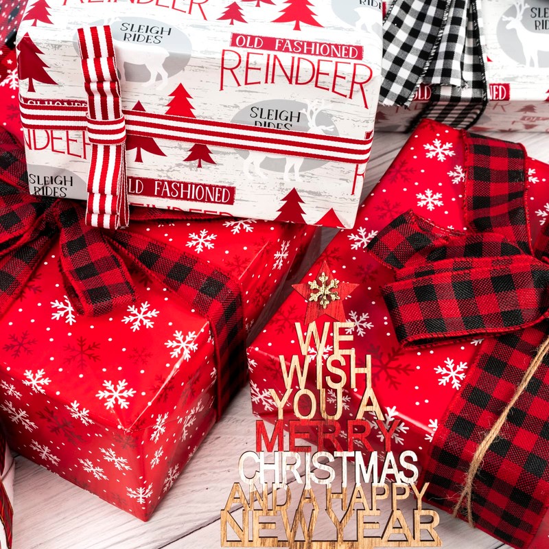 - REVERSIBLE: Red and white snowflakes printed on one side, and red and black buffalo plaid reindeer printed on the reverse. Two different designs make unique and varied gift presentations easy
