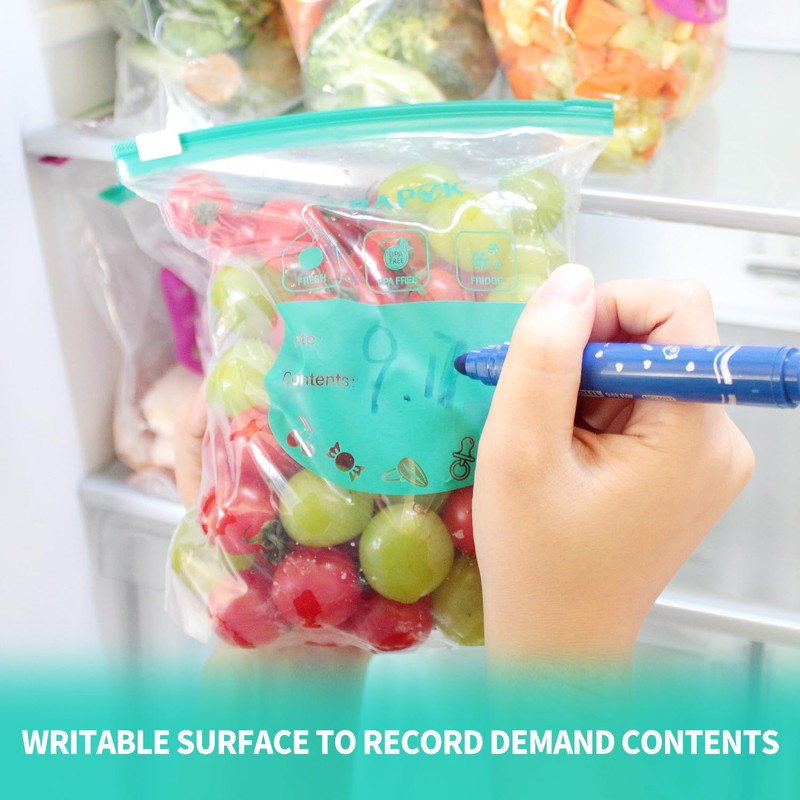 - Leak-Proof and Writable Features - Excellent zipper allow reusable freezer bags to store soups or other liquid juices easily and without any worry of leakage. Meanwhile, Writable surface of large ziplock bags can be used to record date or inside contents that you will recognize the information quickly