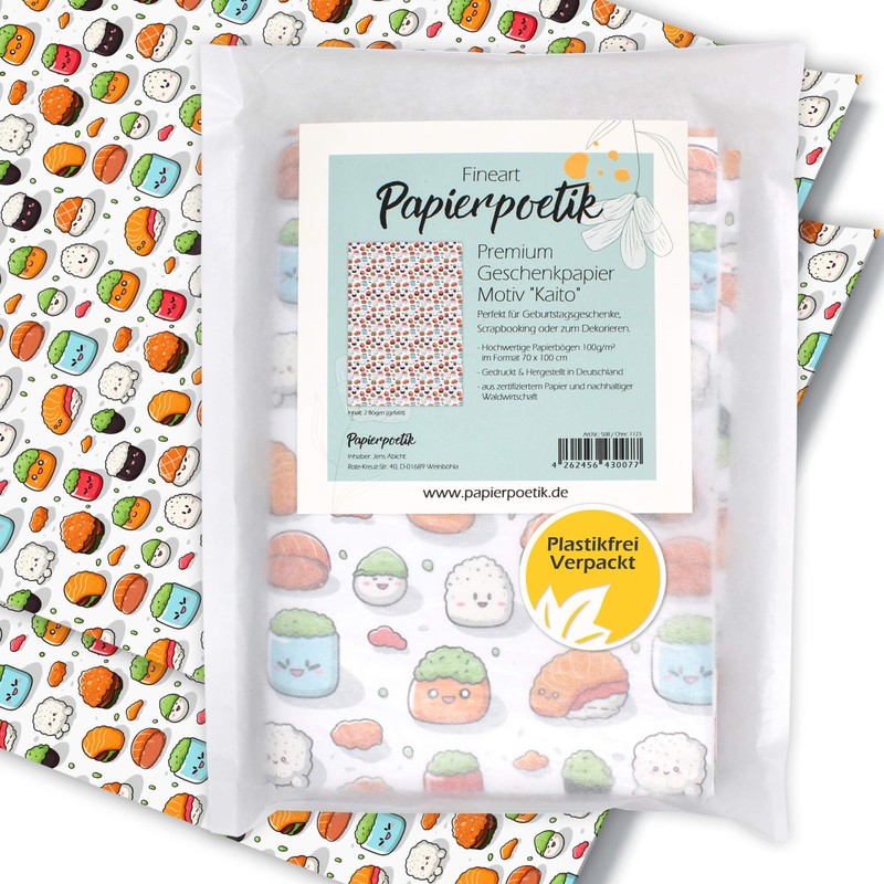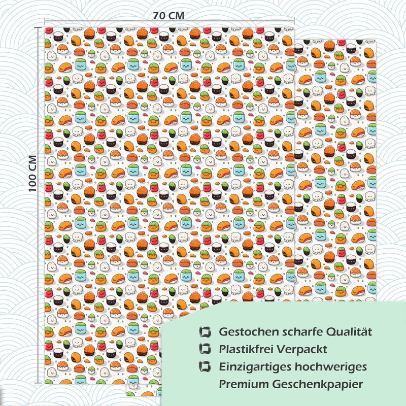 Immerse yourself in the crazy world of sushi style with our exquisite premium sushi design wrapping paper, perfectly tailored to the dimensions of 70 x 100 cm. This exceptional gift packaging will not only make your gifts shine, but also bring a smile to the faces of your loved ones.