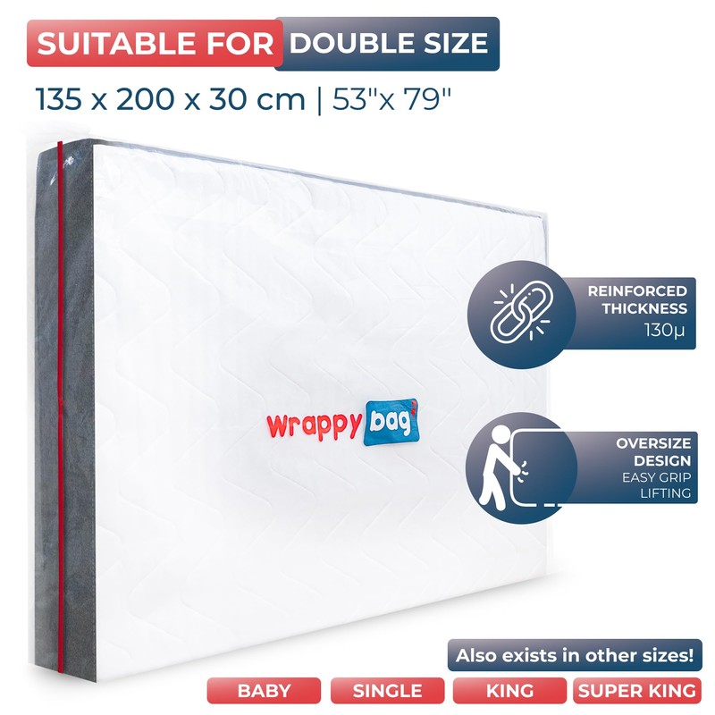 WRAPPYBAG – Protective Plastic Mattress Case — Double Size — Waterproof, Anti-Tear Storage Bag — for House Moves, Storage and Transport (55" x 80")