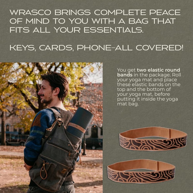 - Adhering to the exceptional standards set by its predecessor, WRASCO's 2.0 yoga mat bags now have an enhanced design based on user feedback. Building upon the same foundation of 12oz durable canvas, rust-free metals, premium elastics, and robust zippers, the upgraded version features a longer adjustable strap and can use the water bottle compartment in the backpack mode too.