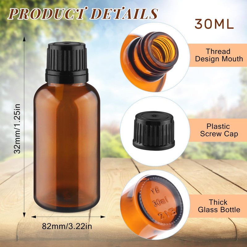 - 【UV Protection】: the amber glass bottle has UV protection which keeps the sensitive liquid from degrading, maintaining the essential oil or other liquids better and preventing them from losing their properties.