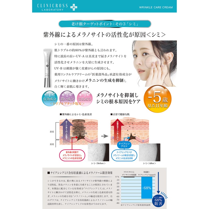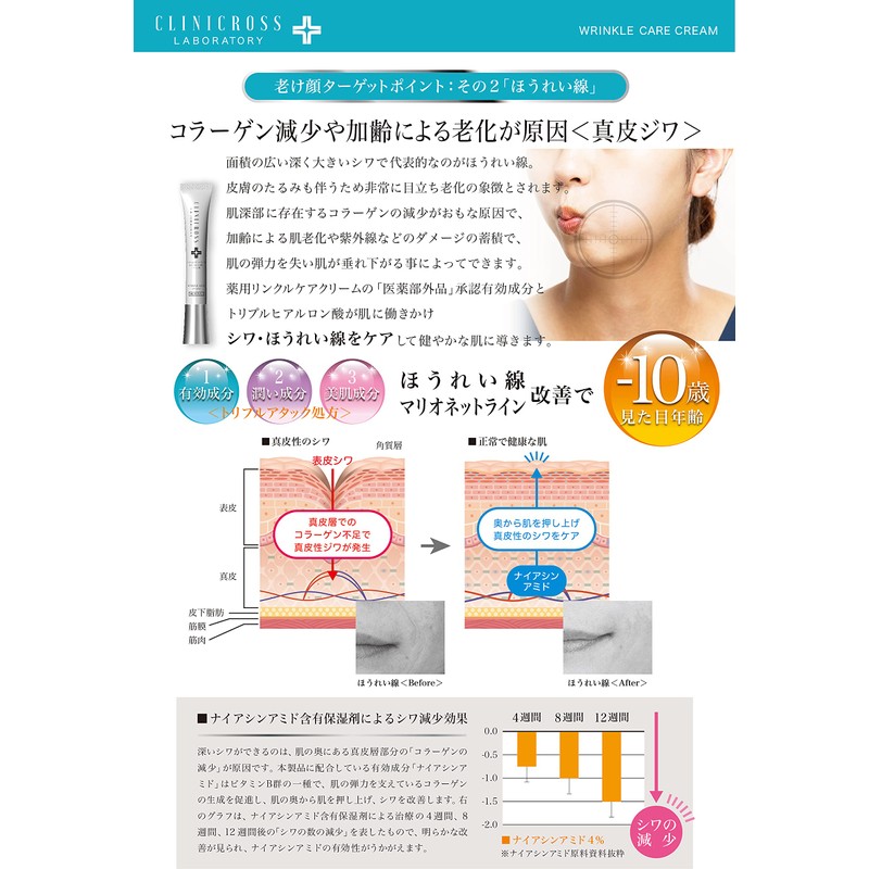 Niacinamide + 2 active ingredients to care for 3 major skin problems. Can be used for the entire aspect of your eyes and mouth. This wrinkled cream is recommended for those who are concerned about troubles such as wrinkles, stains, and bumpy wrinkles. Formulated with a large number of ingredients, it provides total care for your eyes and mouth. It can also be used for those who are concerned about staining hands. Precautions for Use: Do not use on mucosa, wounds, or inflammation parts. Please do not use on areas that have more than scratches, swelling, and plaster. Please use caution for any skin abnormalities. Discontinue use if cosmetics do not fit your skin or if such as: If you continue to use it as is, the symptoms may deteriorate, so we recommend consult a dermatologist. 1. If you see any abnormalities such as redness, swelling, itchiness, irritation, color loss or blackheads during use. 2. If the above symptoms come together with sunlight directly on your skin Please do not touch the mucous membrane with your hands using the product. Do not store in extreme hot or cold temperatures, or in direct sunlight. Keep out of reach of infants. [How to use] Take an appropriate amount (small pearl) on areas of concern, such as the eyes and mouth, and gently stretch it to the whole area in a circular motion. We have made a additive-free formula that is designed to be used even with sensitive skin. Additive-free formula, parapen, alcohol, mineral oil, petroleum surfactant, synthetic fragrance, synthetic coloring