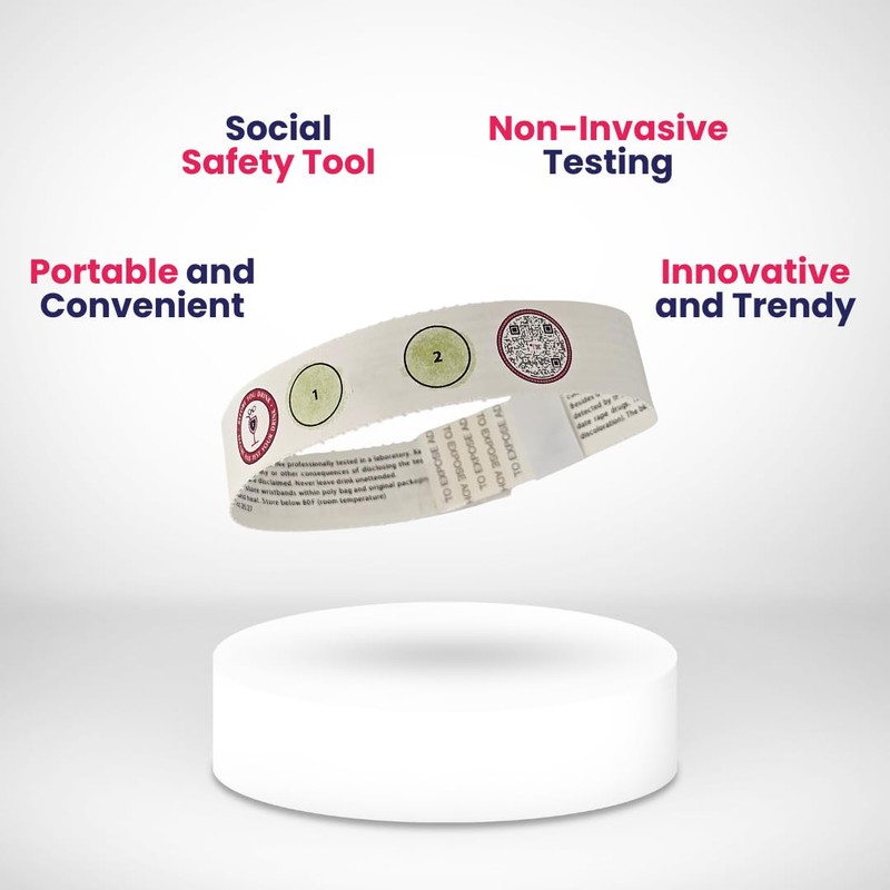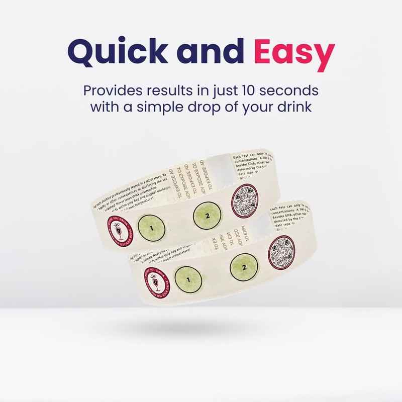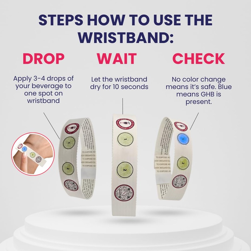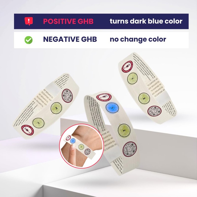 - Use the enclosed wristband to test the safety of your beverage. First Wristband Bracelet tester designed to detect or test GHB in 10 seconds. Pack with 4 Wristband - 8 Tests in total (2 GHB test per wristband). Spiking drink protection Detector.