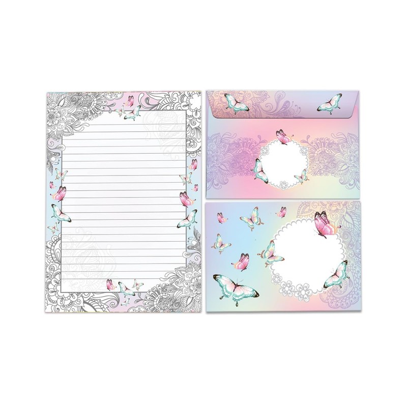 Writing Paper Set with 2 Writing Pads for Girls Kids Butterfly Flowers (1 Pad Colourful and 1 Pad for Colouring A5 with 25 Sheets Each + 25 Envelopes)