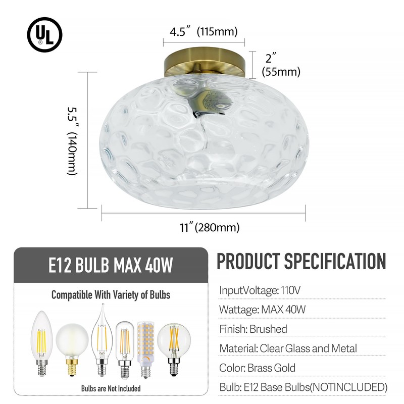- Modern Elegance: Elevate your home with our stunning 11" Brushed Brass Gold Semi Flush Mount Ceiling Fixture. It features a hand-blown art hammered glass shade with transparent light transmission, creating a gorgeous atmosphere. Product size: Dia11" x H7 5/8”.