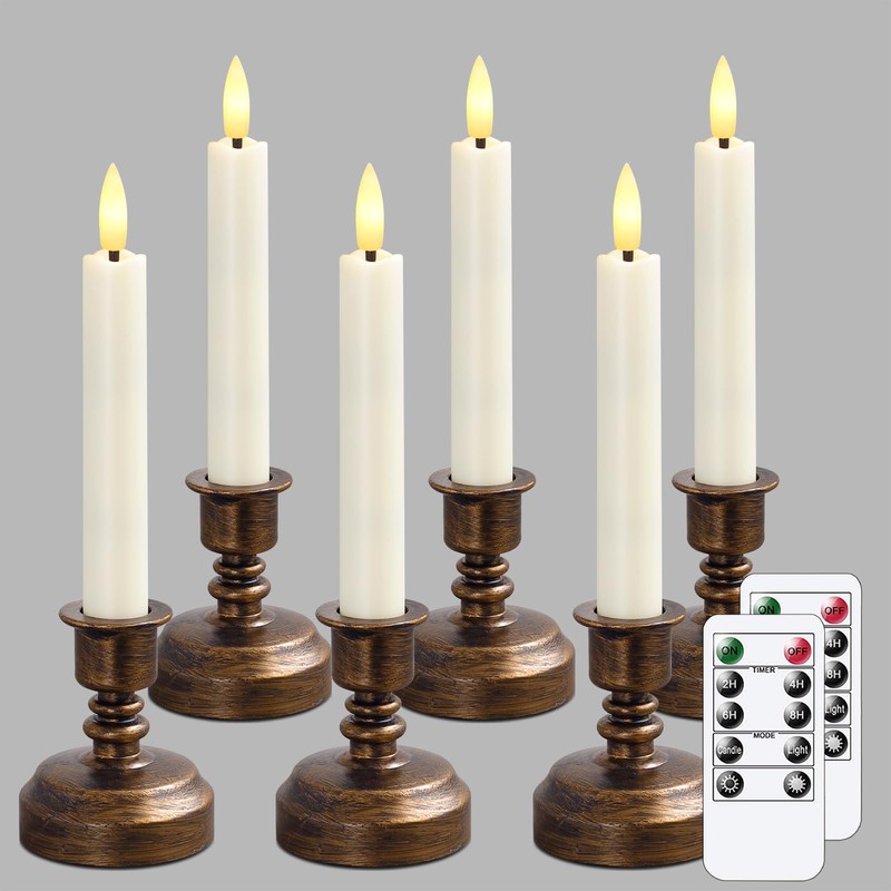 Wroxipel LED Battery Operated 2 Remotes & Cycle Timer 0.78" x6.4" Ivory Plastic Taper Candles, Flameless Flickering Pack of 6 Long Lasting Candles (Included 6pcs Antique Bronze Candlesticks)