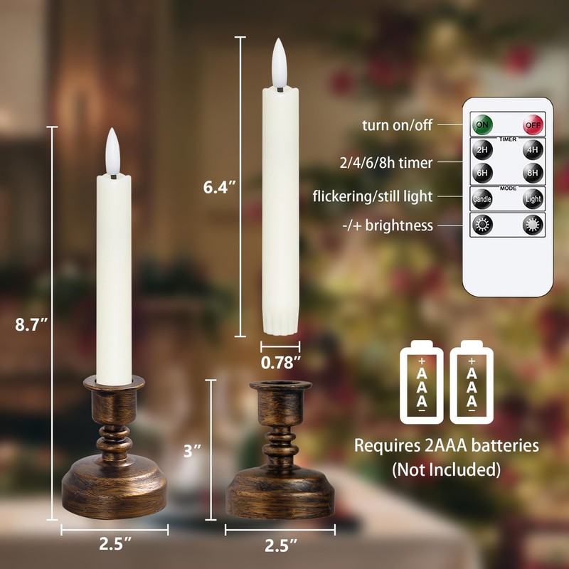 • Versatile Remote Control for Easy Use: You can turn the battery operated taper candles on or off, adjust the brightness, set a timer for 2, 4, 6, or 8 hours, and switch between flickering or steady light modes—all within 23 feet