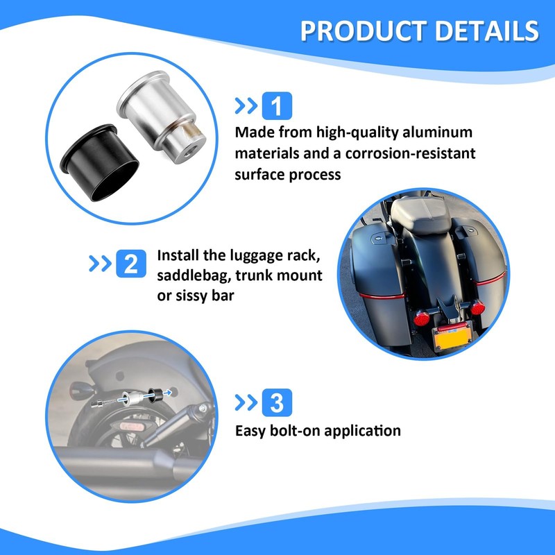 • 【Material】This sissy bar docking spool kit is made from aluminum materials and a corrosion-resistant surface process, this kit provides a durable and long-lasting solution for attaching accessories to your motorcycle.