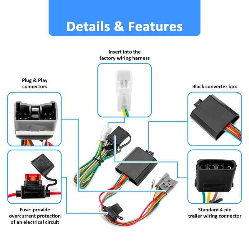 - [Package List] - 1 x 4-Pin Trailer Wiring Harness with installation instructions (including black signal converter, plug&play connector, red fuse and holder, Standard 4-pin trailer wiring connector, Battery connection wire ,and other necessary wiring components ), You do not need to purchase additional accessories, with installation instructions to make your installation easier.
