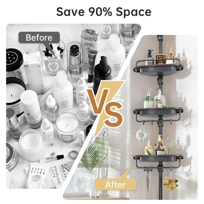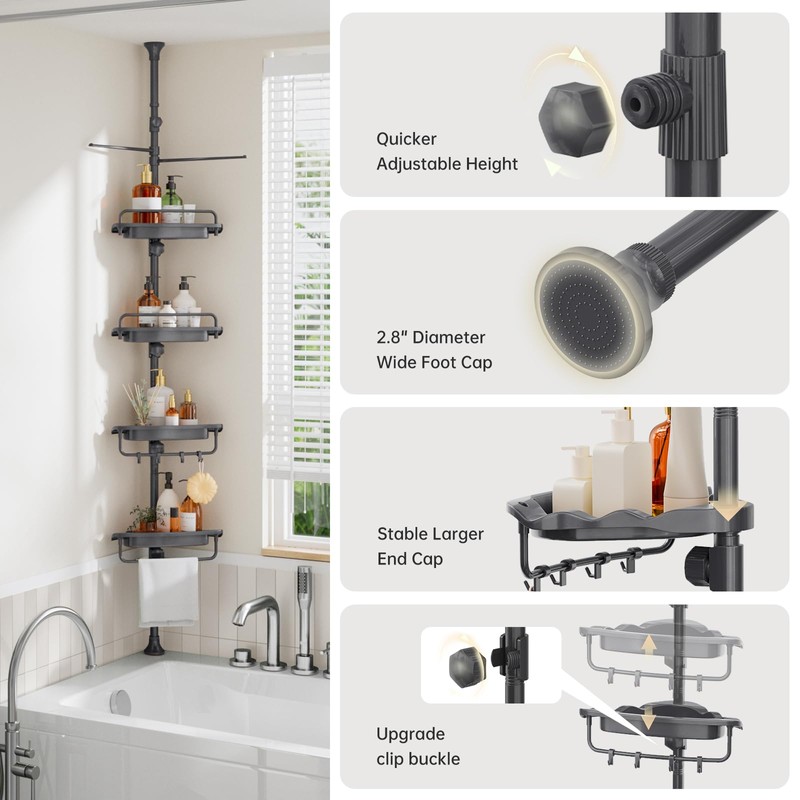 - 👑【EASY INSTALLATION & BROAD COMPATIBILITY】-Achieve a no-drill, tool-free setup with this shower caddy, featuring non-damaging rubber end caps for added stability. Suitable for most showers with heights between 38.8-122.7inch, excluding sloped ceilings.