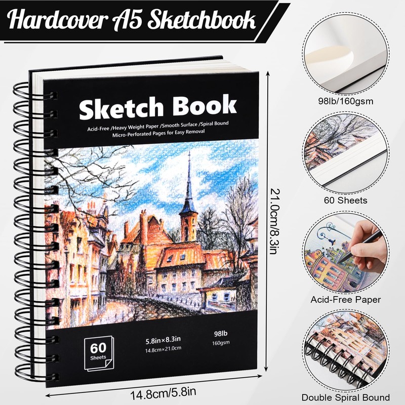 - 【A5 Art Book & Sketchbook 】Premium 14.8×21cm format (5.8×8.3") with 120-page capacity (60 sheets), offering expansive space for creative exploration. Ideal art book format preserves sketches while accommodating various mediums from pencil to pastel
