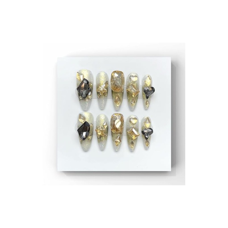 Wsliana Handmade Press On Nails - Long Almond Shape with Gold Glitter and Rhinestones, 10pcs Glue On Acrylic Fake Nails with Storage Box | Stylish Nail Kit (051 S)
