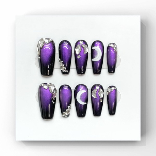 Wsliana Handmade Press On Nails - Purple Ballerina Shape with Hand-Painted Moon Design and Rhinestones, 10pcs Glue On Acrylic Fake Nails with Storage Box | Stylish & Long-Lasting Nail Kit (061 XS)