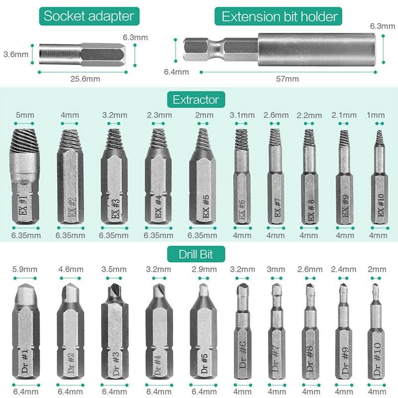 - MOST USE : 22 pieces stripped screw extractor Set work with any drill and all the screw size or bolt These extractor tools are used to reverse the damaged screw counterclockwise until it is released.