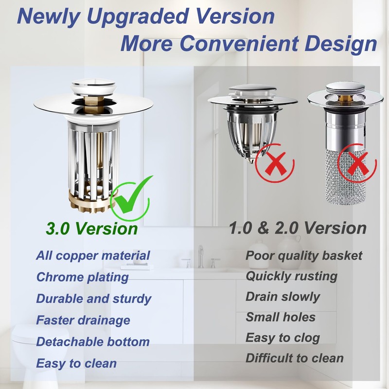 All-Copper and Chrome-Plated: This upgraded bathroom sink stoppers replacement kit is crafted from solid copper for superior durability-outlasting stainless steel,disposable or cheap plastic plugs. The bounce-action push-button design lets you press to store water or drain instantly, while the removable mesh core enhances clog resistance.The pop-up drain stopper bathroom sink features a flawless chrome finish, blending seamlessly with your vanity. Its overflow guard prevents spills, and the silicone-sealed base ensures a tight fit in standard 1.1-1.6 inch drains.