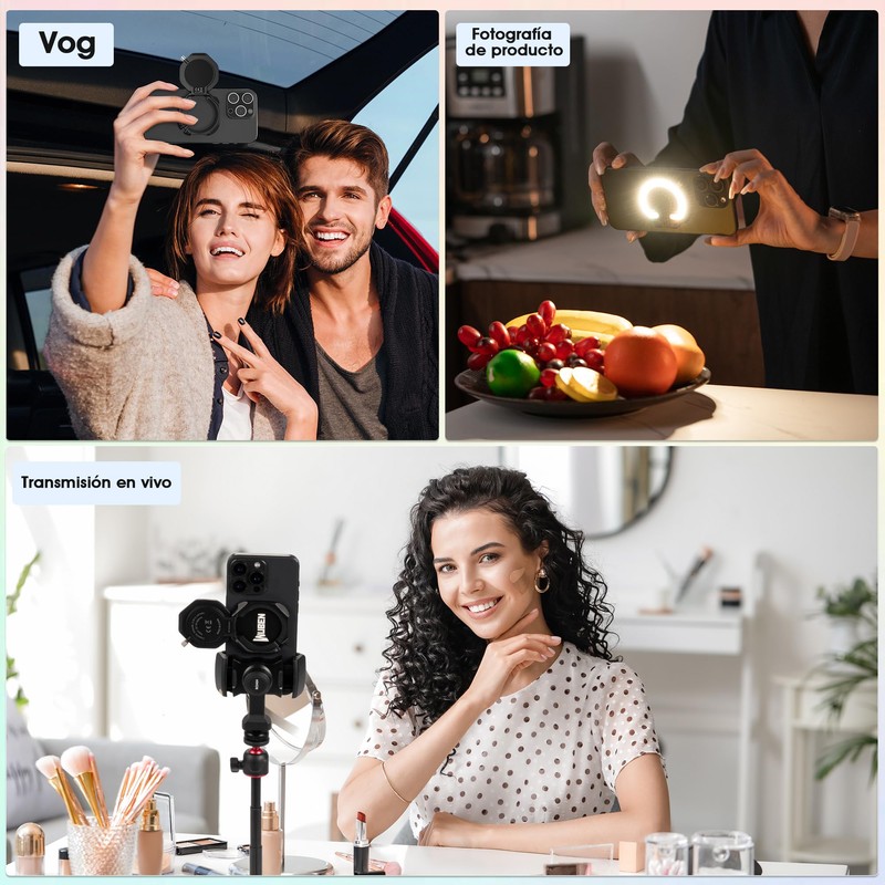 - SOPORTE MAGNÉTICO PARA TELÉFONO: Al usar imanes N54 de primera línea en nuestro diseño compatible con MagSafe, mejoramos enormemente la seguridad con la que se adhiere tu dispositivo y su duración. No solo se puede colocar en el teléfono como luz de relleno, sino que también puede ser un soporte para teléfono que se puede ajustar a cualquier ángulo. Se puede instalar y quitar fácilmente, y también se puede fijar firmemente en cualquier superficie de hierro