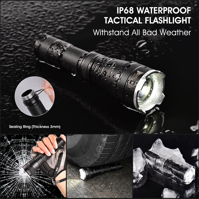- Flashlight waterproof IP68 and robust material: LED torch is made of aviation grade aluminium alloy, 1 m impact resistant, IP68 waterproof, dustproof and non-slip. The design is designed for hard use and harsh weather conditions. Pretty and unique head design allows you to easily distinguish whether the torch is switched on or not when it is standing. This outdoor torch waterproof is suitable for outdoor, camping, hiking, dog walking, car repair, home use, emergency, etc.