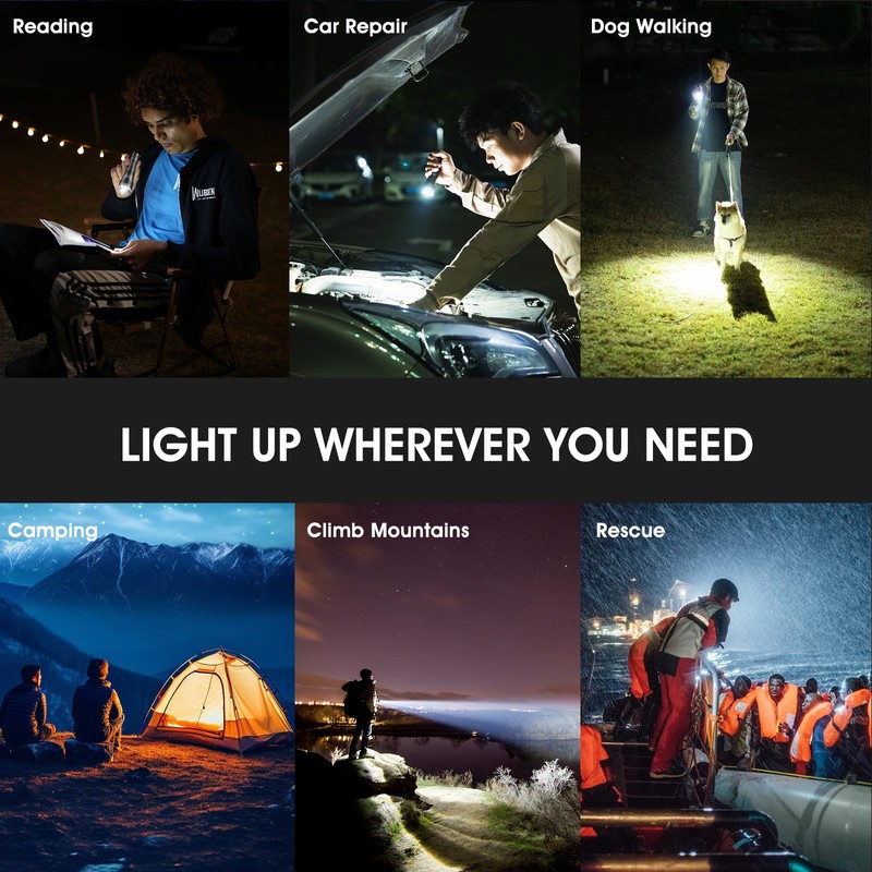 - LED torch, extra long running time and constant light current: WUBEN LED torch has an extra long running time in eco mode, which can last up to 219 hours, which is 15 times longer than other LED flashlights, and continues to light for a long time to maintain a constant luminous flux. The maximum 1200 lumens can emit the constant current system prevents the lumen output of your torch from decreasing over time. Outdoor torch has intelligent temperature control to ensure stable lumens brightness and torch rechargeable temperature.