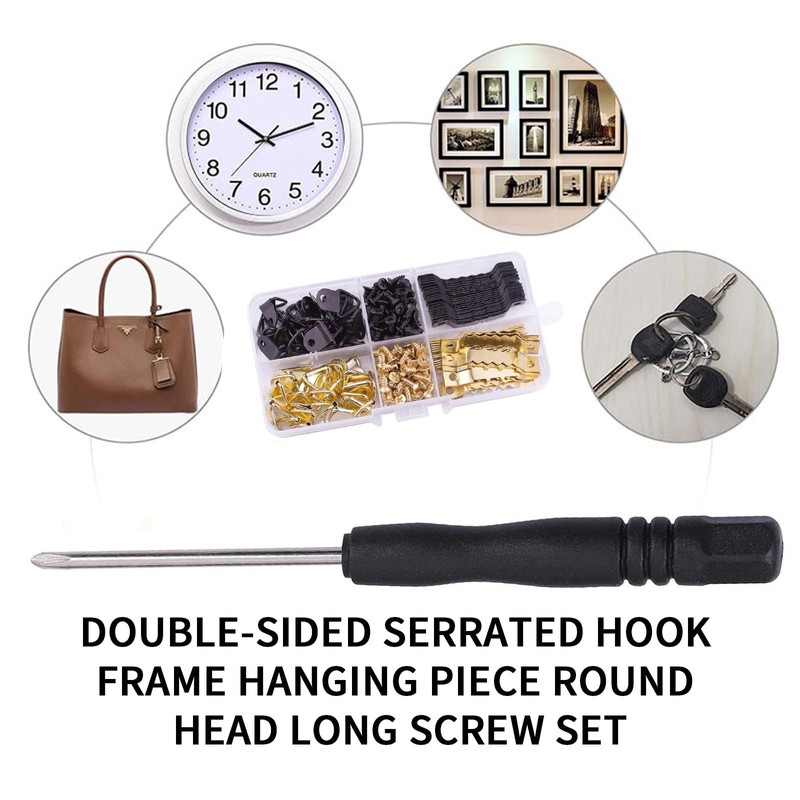 - ⚒ PACKAGE CONTENT: The picture hanger includes 50 sawtooth hooks, 50 triangle hooks, 150 screws with 1 compartment box, a variety of hooks to meet all your needs.
