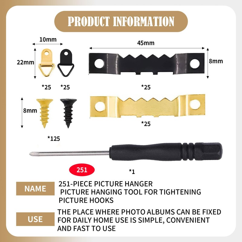 WUERKIYA picture hanger 251-piece, picture hanging tool for tightening picture hooks, picture frame hooks, toothed hangers, canvas hangers, picture frame hangers, picture hangers