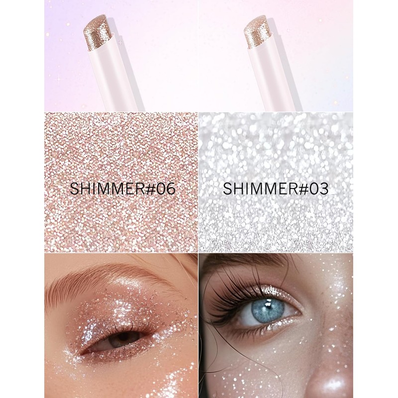 - Multi-Use Glitter Eyeshadow Stick: This shimmer eyeshadow stick doubles as a highlighter, lip color and body shimmer for a radiant glow. Sweep it over cheekbones, brow bones, or collarbones for a lit-from-within highlight, or dab it onto lips for a sparkly lip gloss effect