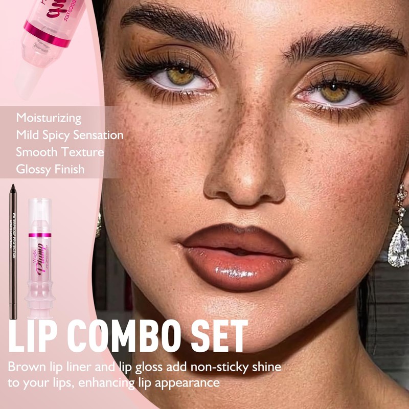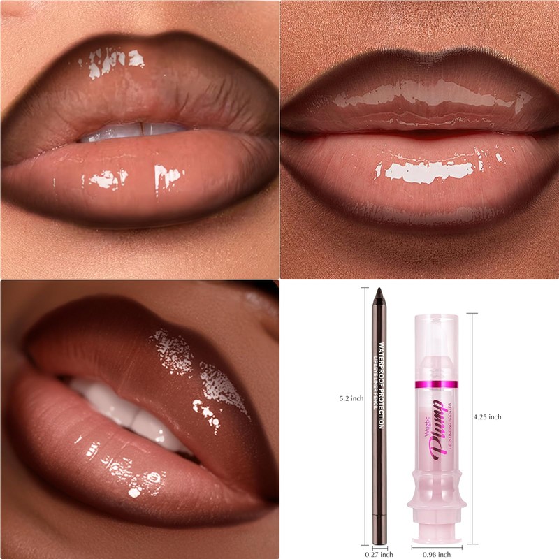 Wugbc Lip Plumper Gloss & Brown Lip Liner, Natural Spicy Plumping Lip Oil Hydrating Lip Combo Glossy Finish Smooth Non-sticky Lip Liner and Gloss Set for Enhancing Lips Appearance