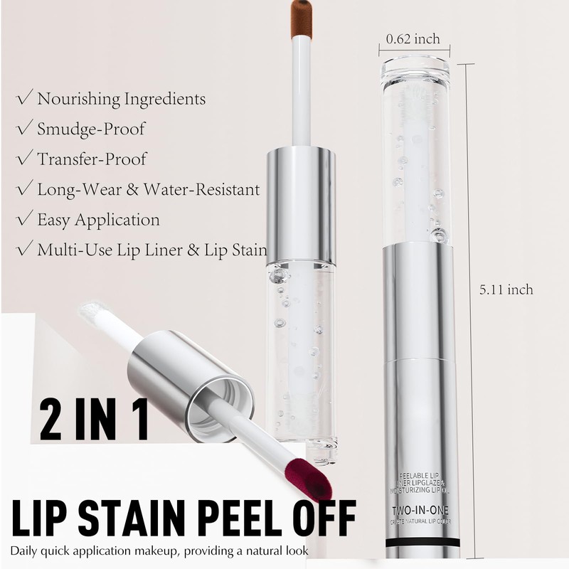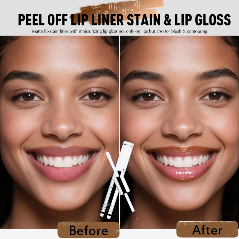 - 2-in-1 Peel Off Lip Liner & Gloss Combo: Achieve ideal defined lips with our lip liner stain and gloss combo! This double head lip stain pen features a precise lip liner for sharp edges & a glossy finish for plump lip look. Whether you want a natural lip tint or bold color, this multi-use lip combo delivers effortless beauty in seconds