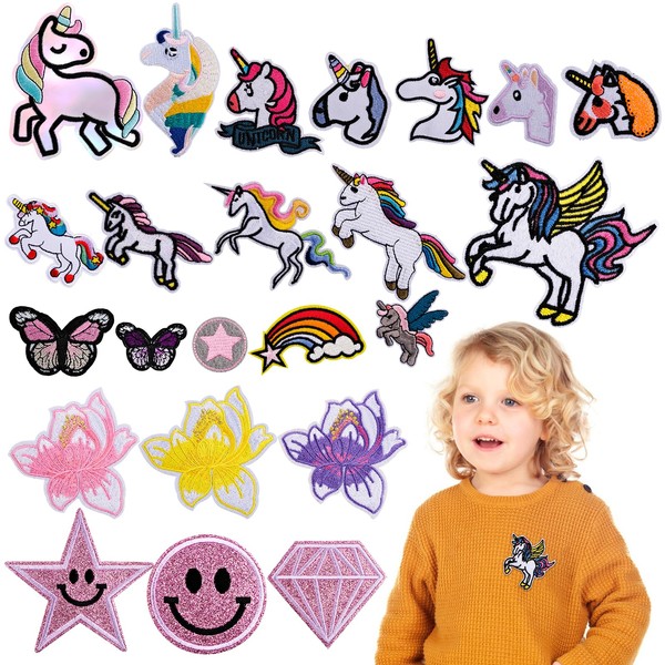 WuGU Pack of 23 iron-on patches for children, iron-on patches, unicorn, iron-on patches for textiles, iron-on transfers children for clothing, jackets, backpacks, jeans, patches, repair the hole, DIY