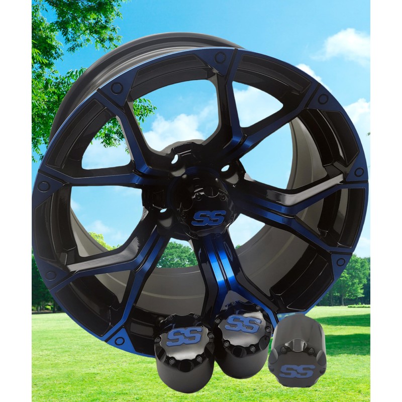 WUKO HUNT Golf Cart SS Wheel Center Cap Cover, ITP Push in Style Wheel Hub Caps for EZGO Club Car Yamaha and Other Models 8,10,12,14 inch Wheel,4 PCS (Gloss Black with Blue SS)